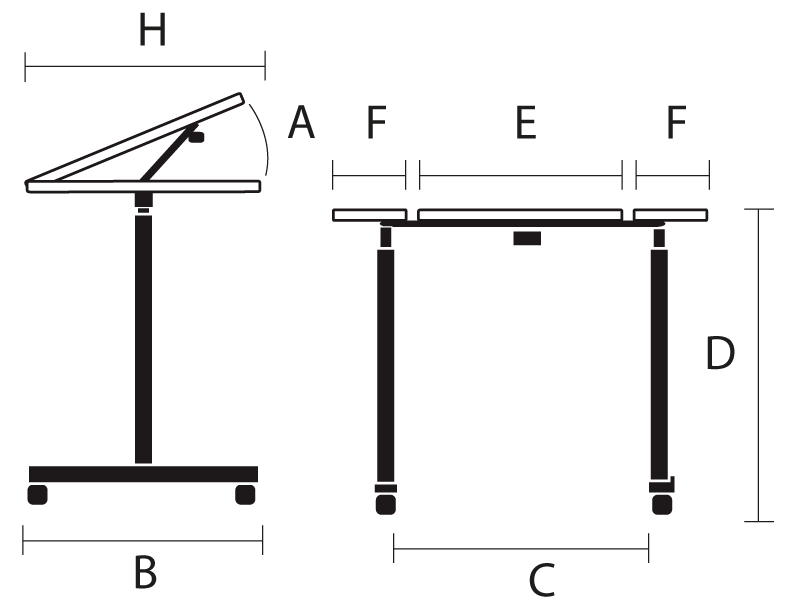 | A | Neigungswinkel Tischplatte | 0 bis 55 Grad |