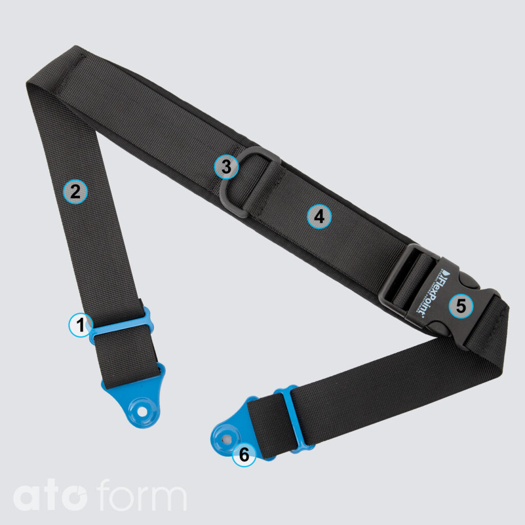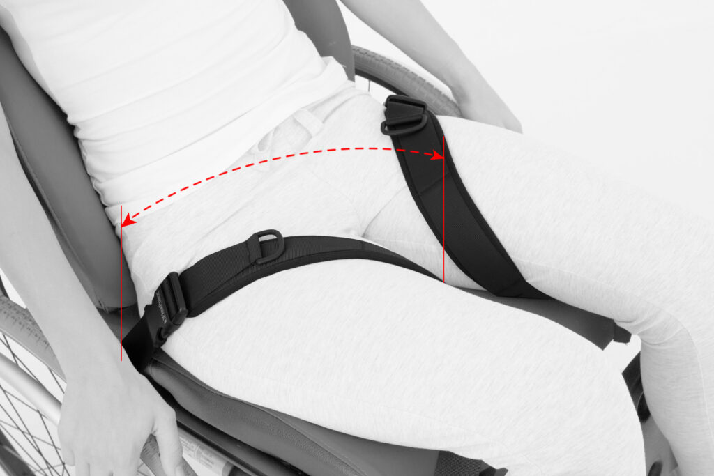 Die Gurte werden jeweils vorne und hinten an der Außenseite des Sitzes angebracht und um den Oberschenkel gewickelt. Die Anordnung bietet eine größere Kontaktfläche mit dem Körper des Nutzers. So wird die Kontrolle der Beinbewegung erhöht. Gleichzeitig verfügt der Nutzer über den vollen Bewegungsfreiraum.