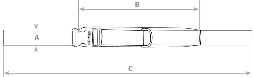 Um die richtige Größe des Gurtes zu wählen, messen Sie den Abstand zwischen der vorderen oberen Darmbeinwirbelsäule und dem Punkt, an dem der innere Oberschenkel den Sitz berührt, wie in der Abbildung gezeigt. (Das ergibt Maß B)